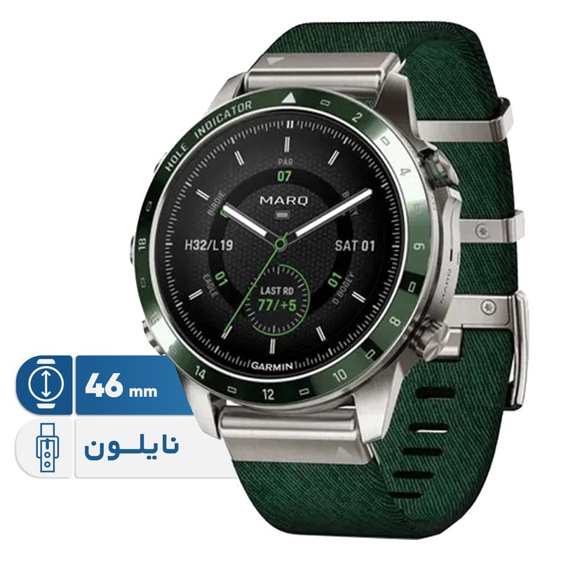 ساعت هوشمند 46 میلیمتری گارمین مدل MARQ Golfer (Gen 2) Titanium با بند پارچهای