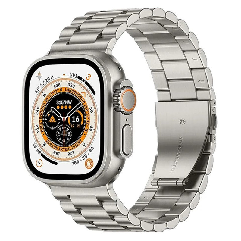 ساعت هوشمند مدل watch ultra دارای قابلیت های صفحه نمایش رنگی، صفحه نمایش لمسی، کنترل موسیقی (Music Player)، کنترل سطح اکسیژن خون، قابلیت مکالمه از طریق بلوتوث بند فلز