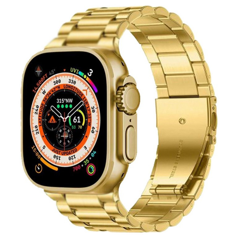 ساعت هوشمند مدل watch ultra دارای قابلیت های صفحه نمایش رنگی، صفحه نمایش لمسی، کنترل موسیقی (Music Player)، کنترل سطح اکسیژن خون، قابلیت مکالمه از طریق بلوتوث بند فلز