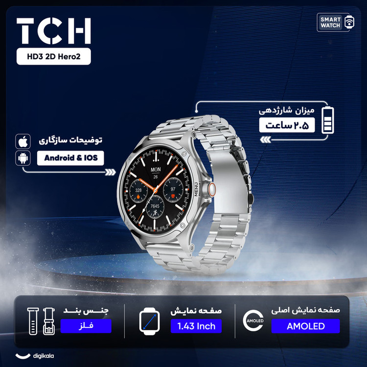 ساعت هوشمند تی سی اچ مدل TCH HD2 3D Hero2 دارای قابلیت های کنترل موسیقی (Music Player)، پشتیبانی از زبان فارسی در منو و سیستمعامل بند فلز