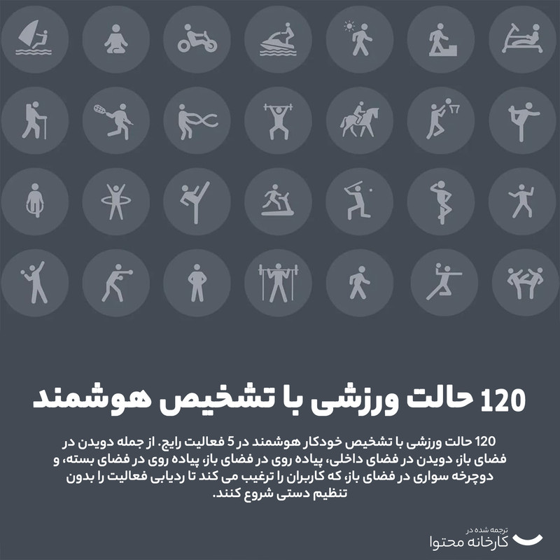پشتیبانی از تمرینات مختلف ورزشی , محاسبه میزان کالری مصرفی , امکان ارائه برنامه تمرینی
