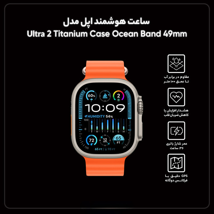 اگر به دنبال ماجراجویی هستید و ساعت هوشمند همهچیز تمامی میخواهید که از هر نظر عملکرد بسیار خوبی داشته باشد، بدون شک ساعت هوشمند اپل مدل Ultra 2 titanium 49mm میتواند یکی از بهترین انتخابهای ممکن برای شما باشد. به نسبت ساعتهای هوشمند سری 9، این ساعت از مشخصات فنی مناسب و بسیار قدرتمندتری بهره برده است. در نمای روبهرویی شاهد حضور صفحهنمایش بزرگ با ابعاد 1.92 اینچ و رزولوشن 410×502 پیکسل هستیم که توانایی نمایش فوقالعاده 338 پیکسل در هر اینچ را دارد. تا همینجا میدانیم که با یکی از قدرتمندترین صفحاتنمایش در بین ساعتهای هوشمند جهان روبهرو هستیم اما شگفتزده میشوید وقتی که بدانید این صفحهنمایش توانایی ارائه حداکثر روشنایی 3000 نیت (nits) را هم دارد. میزان روشنایی که سبب شده تا نهتنها در شرایط نوری متنوع، بلکه برای مثال زیر تابش مستقیم نور خورشید هم وضوح تصویر بینظیری را از آن شاهد باشید. متریال تیتانیموم برای فریم و تکنولوژی ساخت پیشرفته سبب شده تا این ساعت از استاندارد IP6X پشتیبانی کند و در نهایت توانایی مقاومت در عمق 100 متری آب را هم دارد. پس در شرایط جوی متنوع و ورزشهای آبی بدون هیچ نگرانی از این ساعت هوشمند استفاده کنید و لذت ببرید. حضور برنامههای ورزشی متنوع و برنامههای سلامت متنوع که از مهمترین آنها میتوانیم به سنجش اکسیژن خون، کنترل ضربان قلب و سنجش دمای بدن اشاره کنیم سبب شدهاند تا این ساعت هوشمند بیش از خودتان به فکر سلامتیتان باشد. باتری قدرتمند با میزان ظرفیت 542 میلیآمپرساعت هم از دیگر مشخصات در نظر گرفته شده برای این ساعت هوشمند قدرتمند و پرچمدار است. گفتیست که این ساعت با آیفون XS (و بعد از آن) سازگار است؛ البته برای استفاده از تمامی امکانات ساعت، iOS 18 نیاز است.