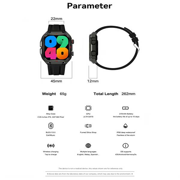 قابلیتهای ساعت هوشمند: صفحه نمایش رنگی , صفحه نمایش لمسی , کنترل موسیقی (Music Player) , کنترل سطح اکسیژن خون , قابلیت مکالمه از طریق بلوتوث , پشتیبانی از زبان فارسی در منو و سیستمعامل , ضد آب , قابلیت تغییر طرح ساعت یا تم