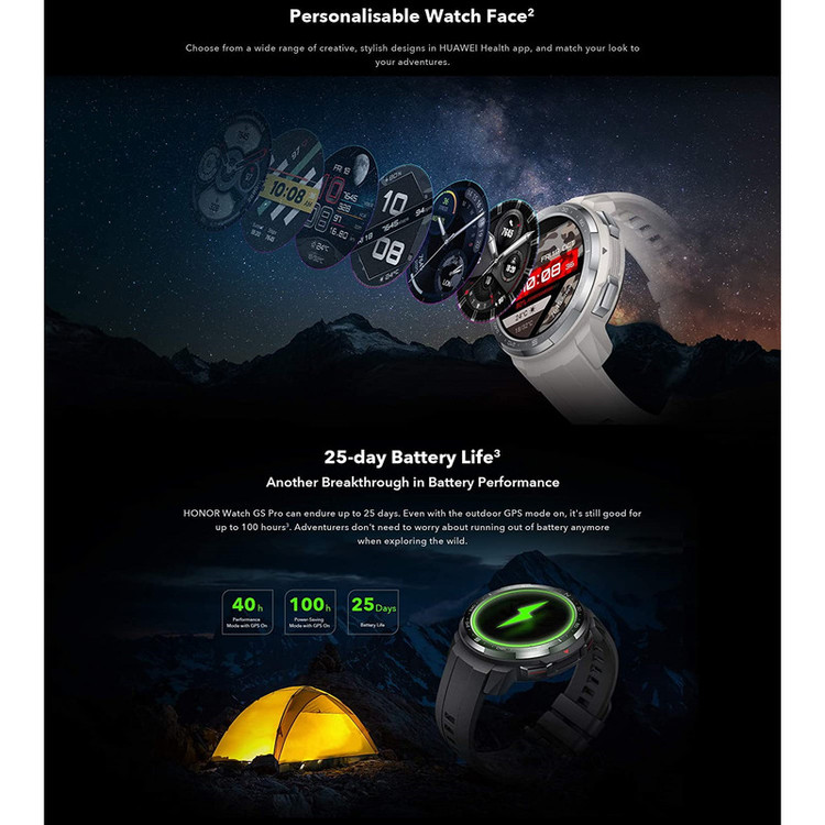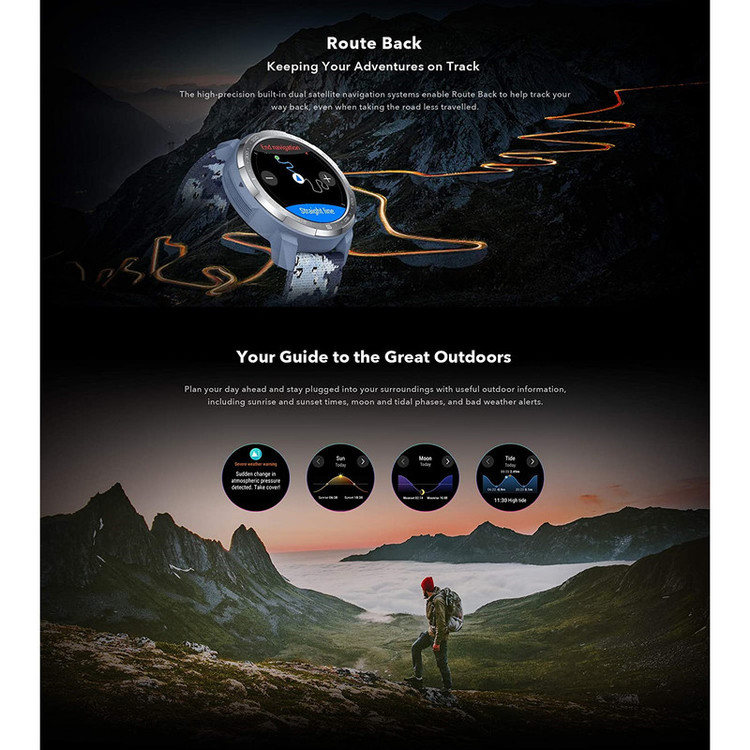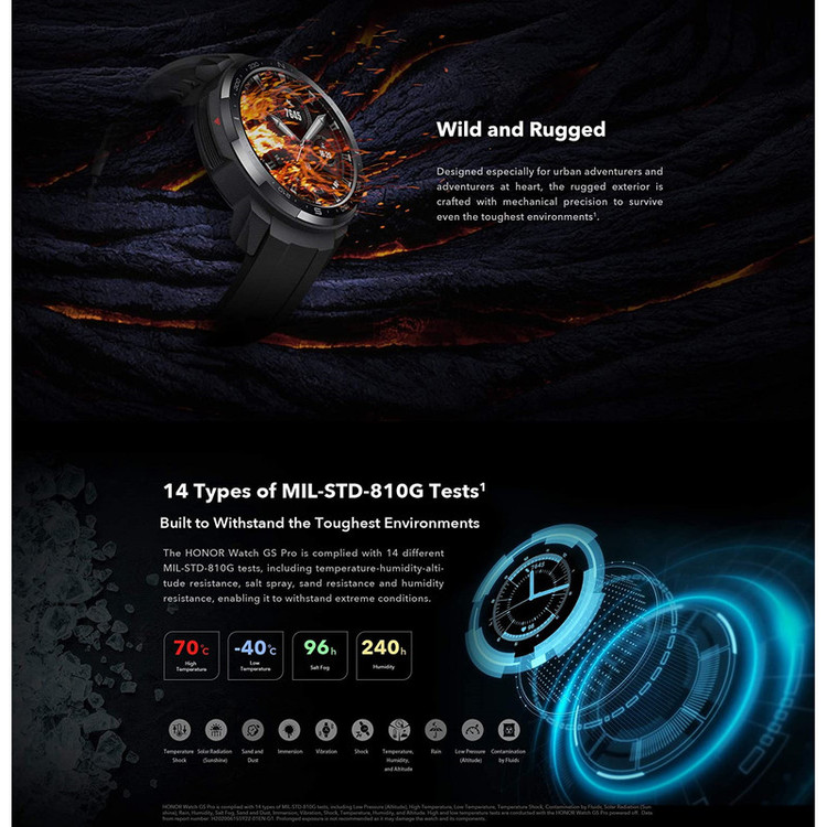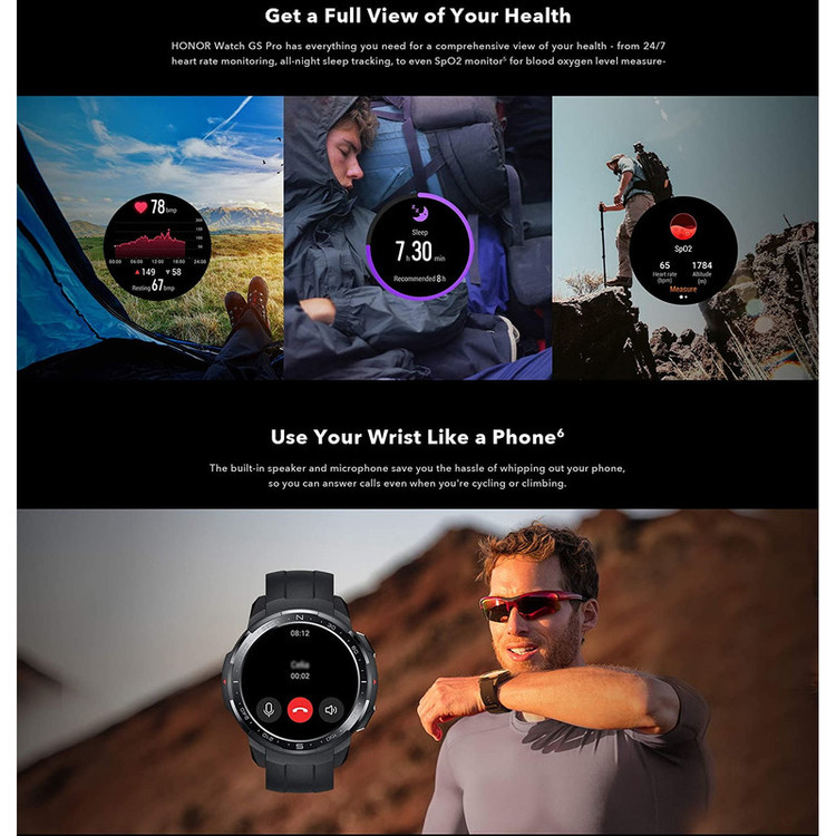 شتاب سنج, ژیروسکوپ, سنجش ضربان قلب, SpO2 جلو شیشه, پشت پلاستیک, نقرهای ضدزنگ bezel ring, dial 5ATM water resistant MIL-STD-810G compliant