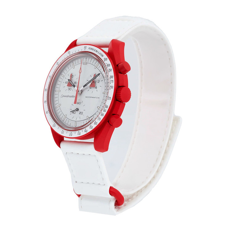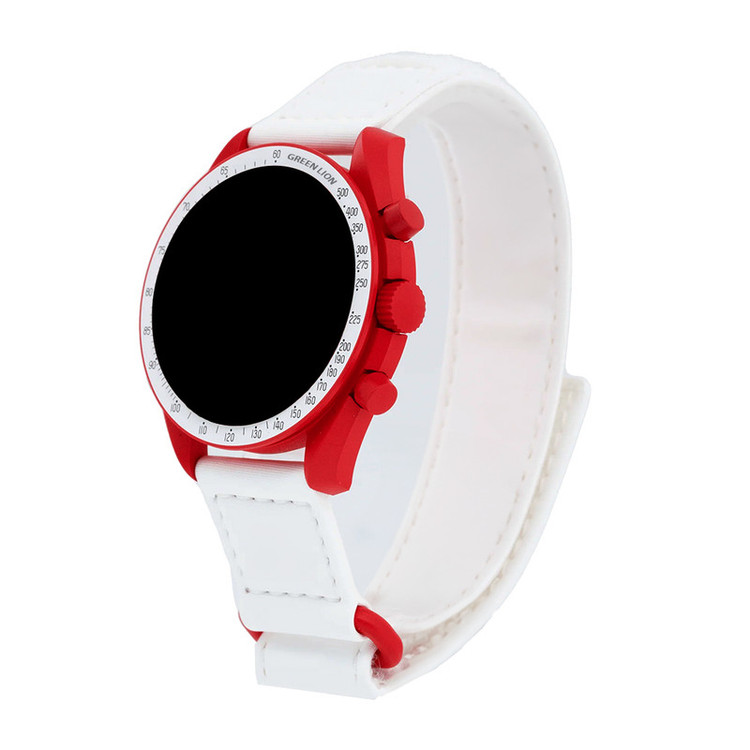 رنگ داخلی ساعت سفید و رنگ بدنه قرمز روشن و بند سفید میباشد.